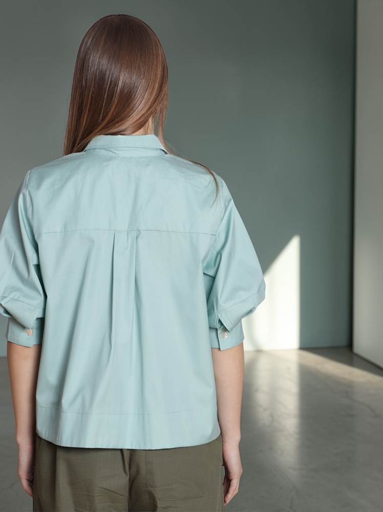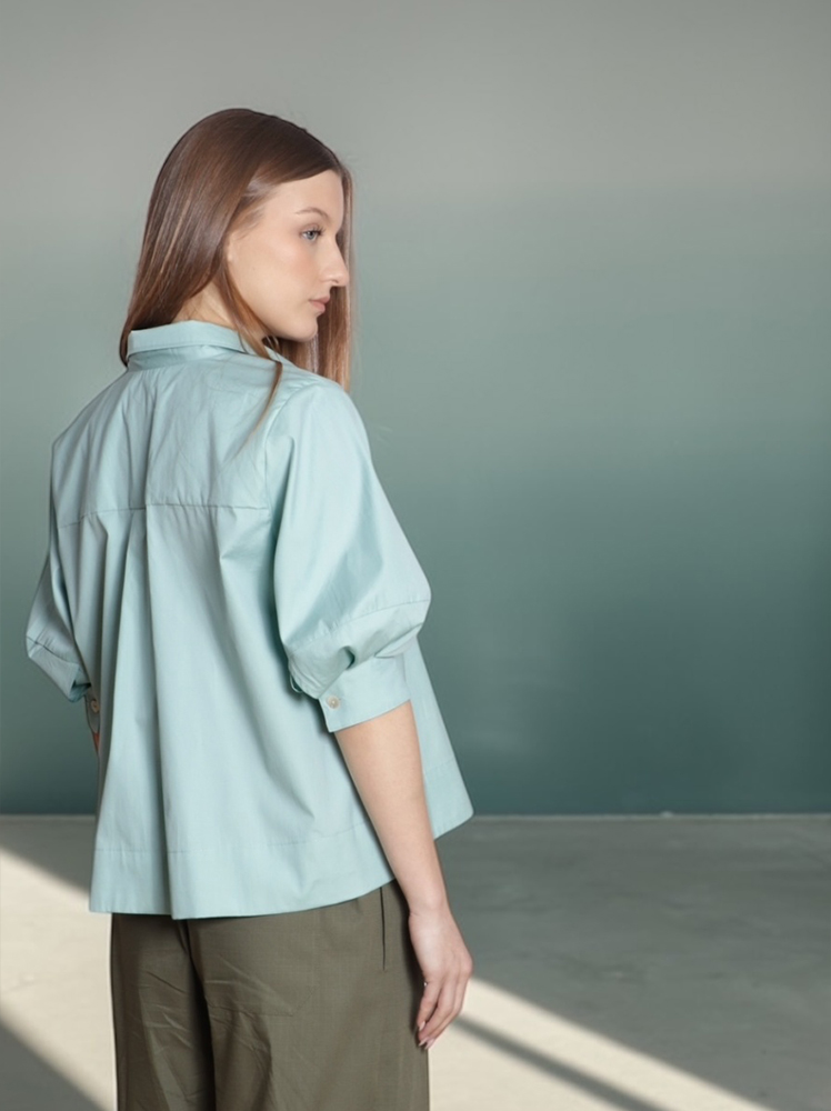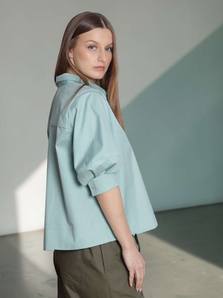 Camisa curta solta em popeline verde àgua. Tem gola de camisaria e aperta com botões de madrepérola escondidos por carcela dupla. A manga tem corte cocoon com punho, comprimento abaixo do cotovelo. Tem 1 bolso de chapa na frente e um pequeno macho no escapulário.