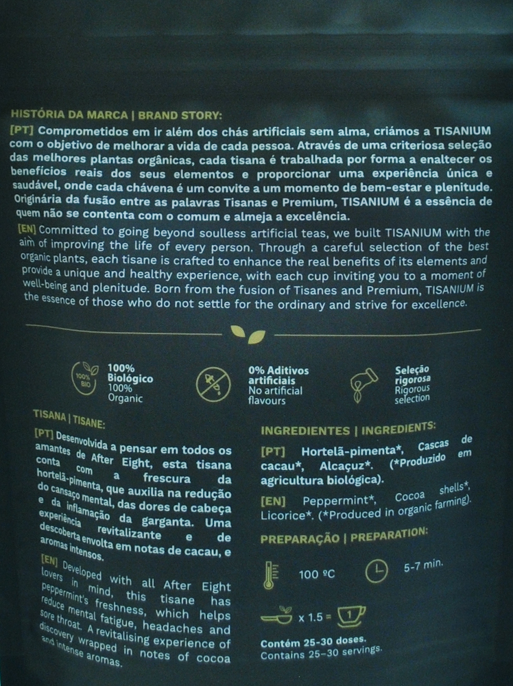Desenvolvida a pensar em todos os amantes do After-Eight. Esta tisana ajuda a reduzir o cansaço mental, enquanto proporciona uma experiência de descoberta através do palato fresco da menta e das suaves notas de chocolate.